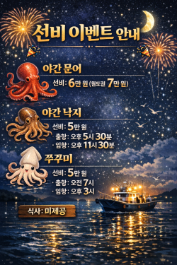 담주. 기상. 좋아지면. 쭈꾸미. 출동 합니다 선비 5만. 이벤트. 진행중식사. 없습니다 *** 사천 포세븐호 예약 안내 ***예약문의 : 010-7268-1472오시는길 : 경상남도 사천시 동금동 579-2홈페이지 : http://fourseven.sunsang24.com/